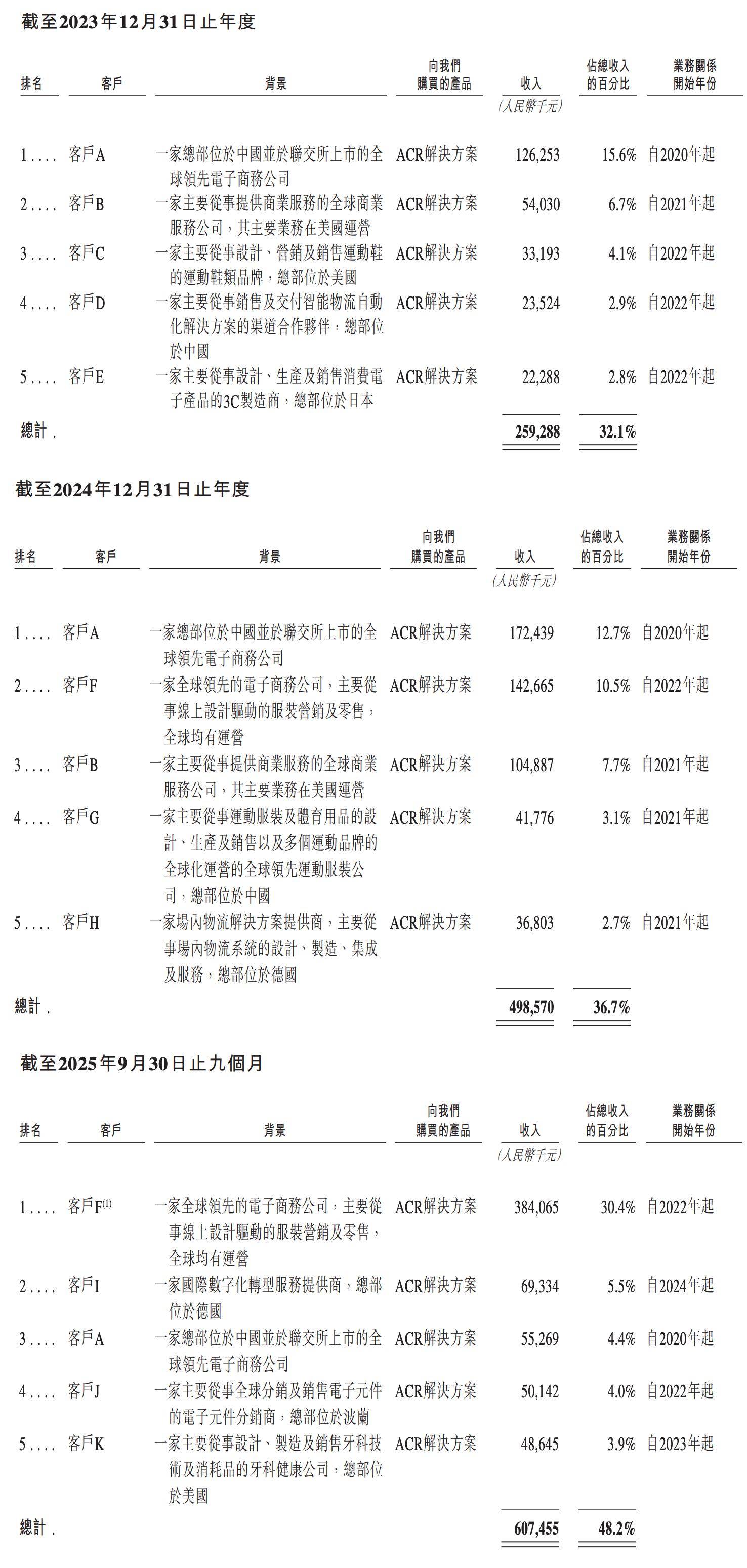 该公司截至2025年9月30日,具有516名研发人员,占总员工人数的近36%。其已正在全球提交2394项专利申请。海柔立异ACR处理方案摆设于由各类企业营运的仓库,涵盖服拆及时髦、电子商务及零售、食物及饮料、第三方物流、医药、3C电子及汽车等范畴,截至2025年9月30日,其已取跨越800名客户签定客户。2023年至2025年前九个月,海柔立异来自前五大客户的收入别离为2。59亿元、4。98亿元、6。08亿元,别离占同期总收入的32。1%、36。7%及48。2%。这一时间段内,其来自最大单一客户的收入别离为1。26亿元、1。72亿元、3。84亿元,占同期总收入的15。6%、12。7%及30。4%。